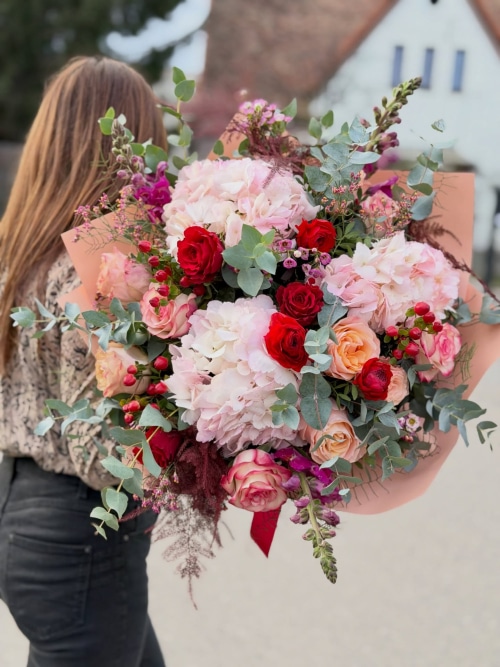 - flori: 3 hortensia, 11 trandafiri, 3 anthirinhum, 3 ranunculus, 3 hypericum, 3 asparagus, 5 limonium, 5 chamelaucium, mix de verdeata