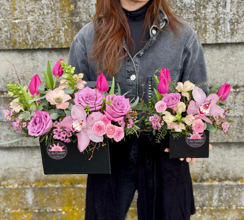 Fiecare set conține două cutii, una mare (30 cm înălțime) și una mică (20 cm înălțime), o dimensiune potrivită pentru fiecare destinatar. Decorate liber cu 20 flori de sezon in nunate de roz: orhidee, lalele, trandafiri anemone, minitrandafri, chamelucium si mix de verdeata. Se vinde doar in set!
